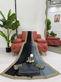 ✔️Saree Fabric : Pixcel Crush ✔️Saree Work : Beautiful Katdana and pearls work ✔️Saree Size :- 5.5 Mtr ✔️Blouse Fabric : Pixcel Crush Fabric ✔️Blouse Size : 0.80 MTR (Un-Stitched)
