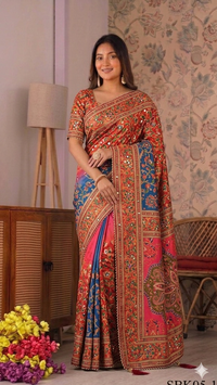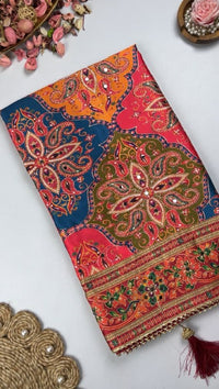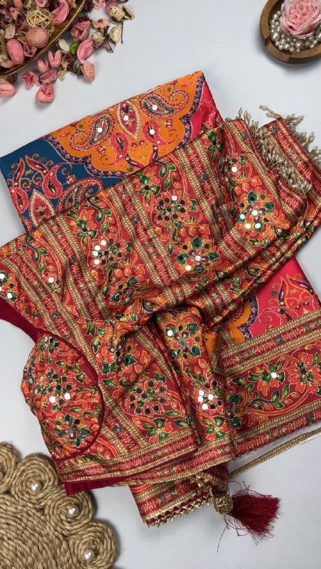 Beautiful Japan Satin Saree With Digital Print Aari & Mirror Work