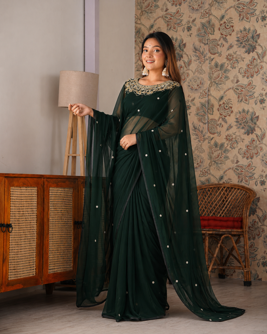 ✔️Saree Fabric : Fandy sattin ✔️Saree Work : Beautiful Sequence butti all over Saree With Rich elegant lace on either side ✔️Saree Length : 5.5 MTR ✔️Blouse Fabric : Fandy sattin ✔️Blouse Work : Sequence...