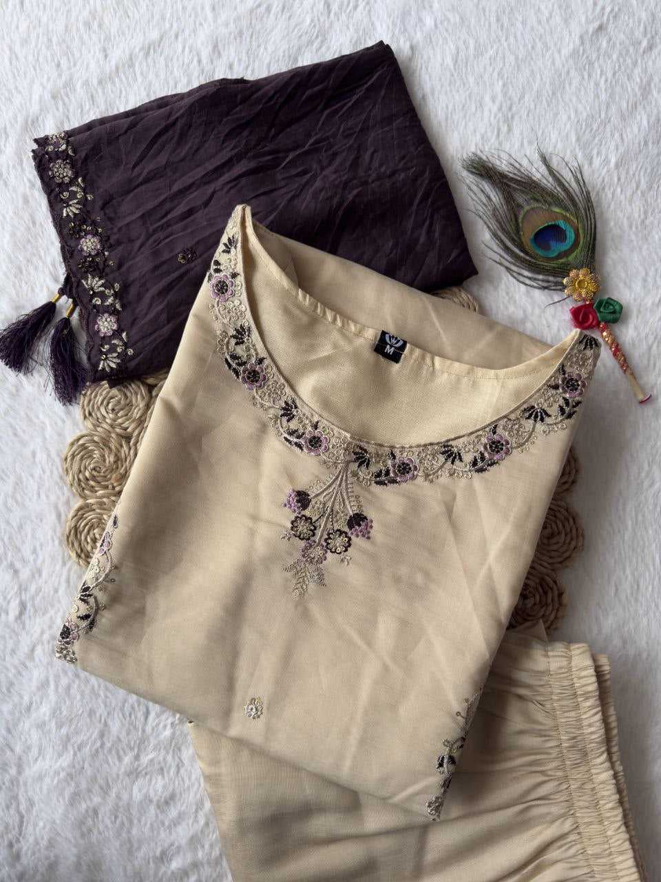 Cream Color Premium Roamn Silk With Embroidery Work Top Pent